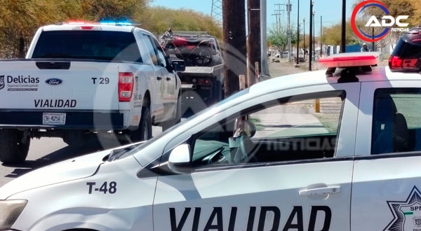 Cd. Delicias, Chih.- Esta tarde, alrededor de la 1:23 pm, se registró un accidente vial en el cruce de la avenida Enrique Sáenz y avenida 16 Sur, en el sector sur de Delicias, cuando un motociclista perdió el control de su unidad tras intentar evadir a elementos del Departamento de Tránsito.