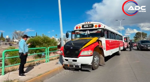 Chihuahua, Chih.- Un camión de transporte de personal identificado con el número económico 4M354 se vio involucrado en un accidente la tarde de este martes, luego de que el conductor aparentemente perdiera el control de la unidad y terminara chocando contra un poste de alumbrado público.