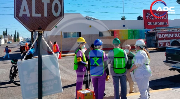 Cd. Delicias, Chih.- Elementos del Departamento de Bomberos, Policía Municipal, Vialidad y el Escuadrón Motorizado realizaron un simulacro de incendio la mañana de este miércoles en la guardería Guardería Fátima, ubicada en el cruce de la calle Cuarta Oriente y avenida Tercera, en el centro de la ciudad.