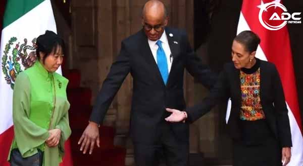Un episodio similar se repitió cuando los tres se encaminaron hacia la escalinata que conduce a los salones de Palacio Nacional para la reunión bilateral, mientras el Presidente visitante volvía a marcar espacio entre su esposa y la Mandataria mexicana.