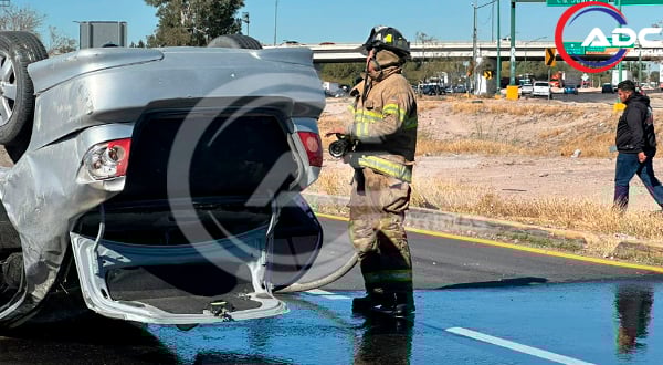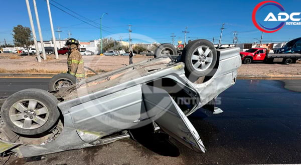 Cd. Delicias, Chih.- Una aparatosa volcadura se registró la tarde de este lunes frente al Infonavit Cielo Vista, generando una intensa movilización de corporaciones de auxilio y seguridad. El vehículo involucrado terminó con el toldo sobre el pavimento y las llantas hacia arriba tras perder el control mientras circulaba a alta velocidad.