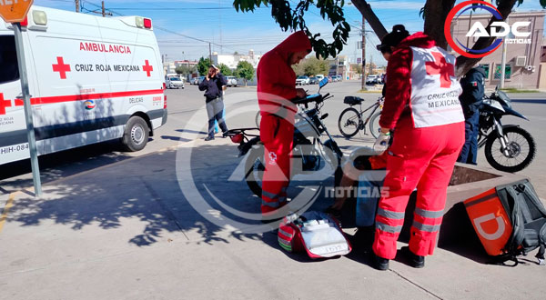Cd. Delicias, Chih.- Un motociclista repartidor fue valorado por paramédicos de Cruz Roja este medio día de miércoles en calles del primer cuadro de la ciudad, tras verse involucrado en un accidente en el que, para evitar chocar contra un vehículo particular, brinco el cordón de concreto de la banqueta y se impactó contra una jardinera.