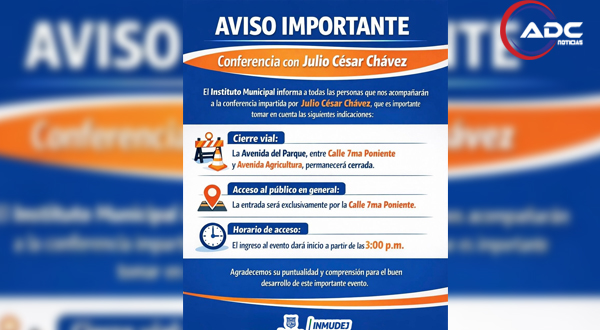 Como parte de las indicaciones para los asistentes, se informó que habrá cierre vial en la Avenida del Parque, en el tramo comprendido entre Calle 7ª Poniente y Avenida Agricultura, por lo que se exhorta a tomar rutas alternas. Asimismo, el acceso al público en general será únicamente por la Calle 7ª Poniente, con el objetivo de mantener el orden y la seguridad durante el evento.