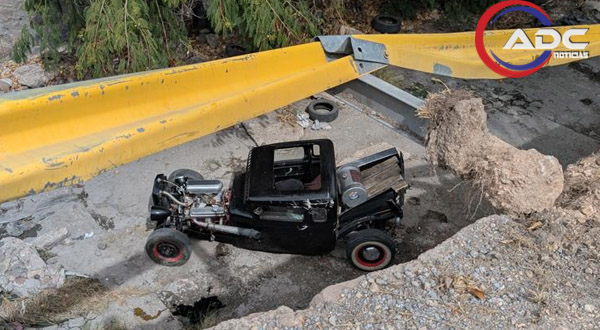 Chihuahua, Chih.-Un hombre de aproximadamente 40 años resultó lesionado luego de perder el control de un Ford Hot Rod clásico negro con motor V8 al intentar dar vuelta en la calle Yucatán, lo que provocó que el vehículo cayera al canal ubicado sobre la avenida Heroico Colegio Militar.