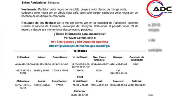 Bocoyna, Chih.- Autoridades solicitan la colaboración de la ciudadanía para localizar a José Isidro Mendoza Rico, un adolescente de 15 años que fue reportado como desaparecido el pasado 9 de febrero en la comunidad de Panalachi, cercana al rancho Ariceachi, en el municipio de Bocoyna.