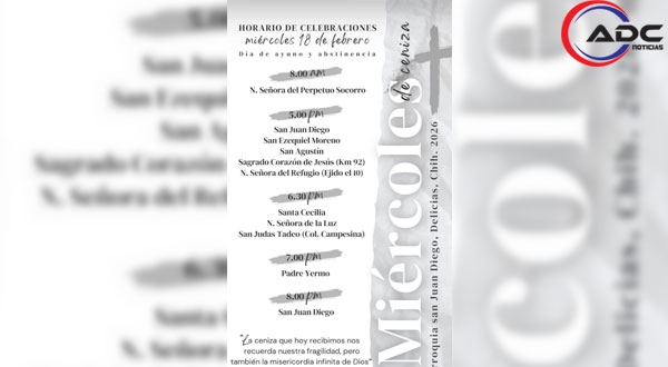 Cd. Delicias, Chih.- Con motivo del Miércoles de Ceniza, que marca el inicio de la Cuaresma, distintas parroquias de Delicias dieron a conocer los horarios de misas y celebraciones de la Palabra para este miércoles 18 de febrero.