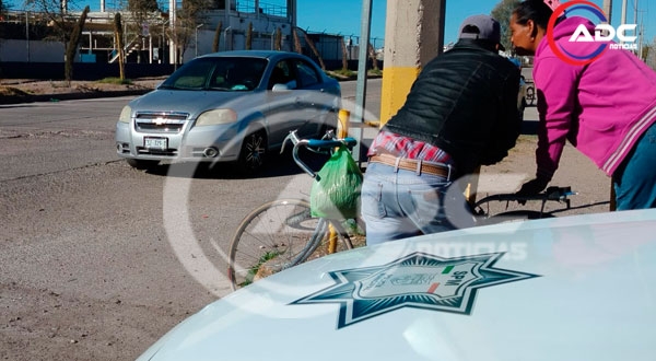 Cd. Delicias, Chih.- Dos ciclistas fueron impactados por un automóvil Chevrolet Aveo en el cruce de la avenida 10 Sur y la avenida Plutarco Elías Calles, aunque afortunadamente no se registraron lesiones graves.