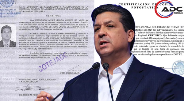 Tamaulipas.- El exgobernador de Tamaulipas, Francisco Javier García Cabeza de Vaca, renunció formalmente a la nacionalidad estadounidense y a cualquier tipo de protección legal o diplomática extranjera, de acuerdo con un documento oficial difundido este miércoles.