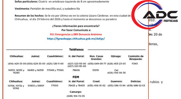 Meoqui, Chih.- La Fiscalía General del Estado activó el protocolo de búsqueda para localizar a la adolescente Ingrid Zamira Villalva Rodríguez, de 15 años de edad, quien fue reportada como desaparecida en la ciudad de Chihuahua.