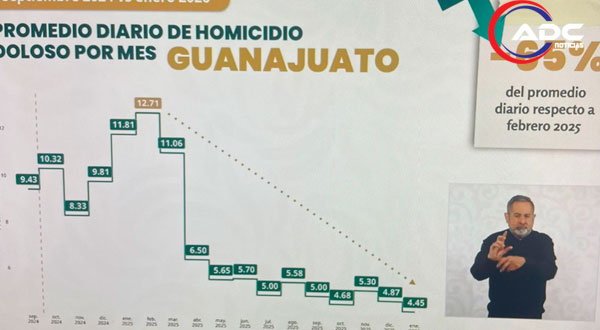 Guanajuato.- Los homicidios dolosos registraron una reducción del 65 por ciento entre septiembre de 2024 y el 31 de enero de 2026, informó Marcela Figueroa, titular del Secretariado Ejecutivo del Sistema Nacional de Seguridad Pública, durante la conferencia matutina encabezada por la presidenta Claudia Sheinbaum en Irapuato.