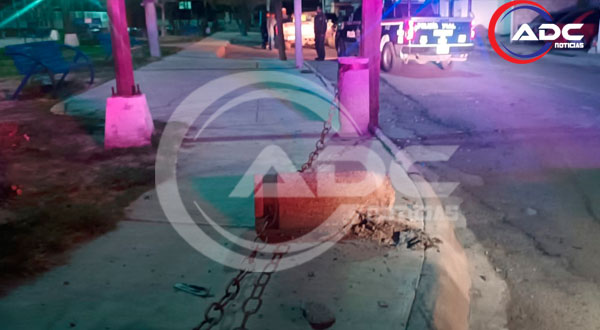 Camargo, Chih.- Minutos después de la medianoche se registró un accidente en la placita ubicada en la colonia Fovissste, en el cruce de la calle Pino y la avenida Luis H. Álvarez, donde una camioneta terminó impactada contra parte de la infraestructura del lugar.