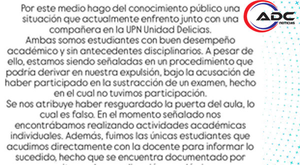 Mediante un comunicado, las estudiantes —quienes aseguran mantener buen desempeño académico y conducta intachable— rechazaron la acusación de haber “vigilado la puerta” mientras presuntamente se cometía el robo de la evaluación. Afirman que en ese momento se encontraban realizando actividades individuales, por lo que consideran infundado el señalamiento.