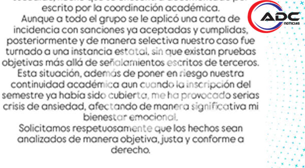 De acuerdo con su versión, aunque inicialmente todo el grupo recibió una sanción que ya fue cumplida, únicamente su caso fue canalizado posteriormente a una instancia estatal, lo que consideran un trato selectivo.
