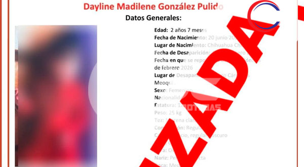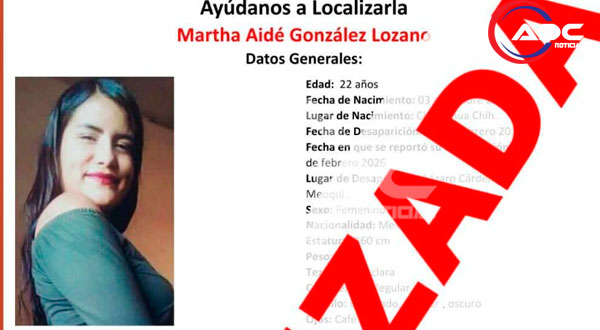 Meoqui, Chih.- La Fiscalía General del Estado informó este martes que Martha Aidé González Lozano, de 22 años, y su hija Dayline Madilene González Pulido, de 2 años y 7 meses, quienes estaban reportadas como desaparecidas desde el 4 de febrero en la localidad de Lázaro Cárdenas, han sido localizadas.