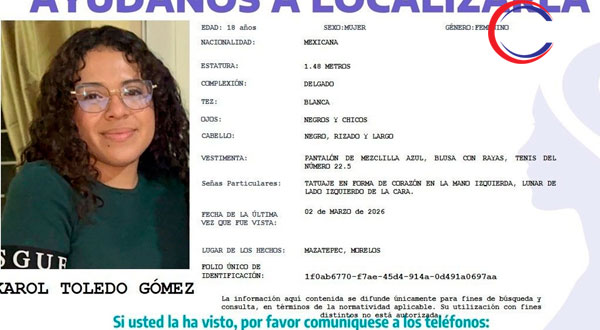 Morelos.- La muerte de Karol Toledo Gómez, joven de 18 años que había sido reportada como desaparecida el pasado lunes 2 de marzo en el estado de Morelos, fue confirmada por autoridades y por la institución donde estudiaba. La joven cursaba la carrera de Derecho en la Escuela de Estudios Superiores (EES) de la Universidad Autónoma del Estado de Morelos (UAEM), ubicada en la colonia El Calvario, en el municipio de Mazatepec.