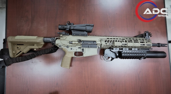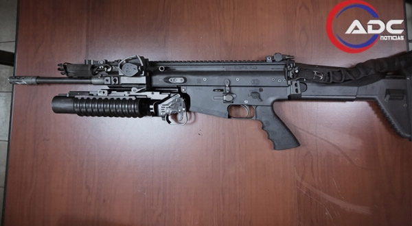 Entre las armas aseguradas a los detenidos se encuentran dos pistolas Colt modelo Government calibre .38 Súper Auto, un fusil FN Herstal modelo SCAR 17S calibre 7.62 x 51 mm, así como un lanzagranadas LMT M203 calibre 40 mm acoplado al fusil. También se aseguró un fusil Barrett modelo M107A1 calibre .50 BMG, considerado armamento de alto poder.