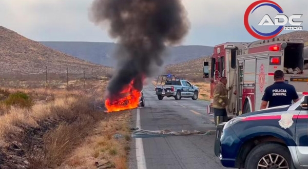 Aldama, Chih.- Un incendio vehicular se registró sobre la carretera que conduce de Aldama a Ojinaga, luego de que una presunta falla mecánica provocara que un automóvil comenzara a arder, lo que generó la movilización de corporaciones de seguridad y emergencia.