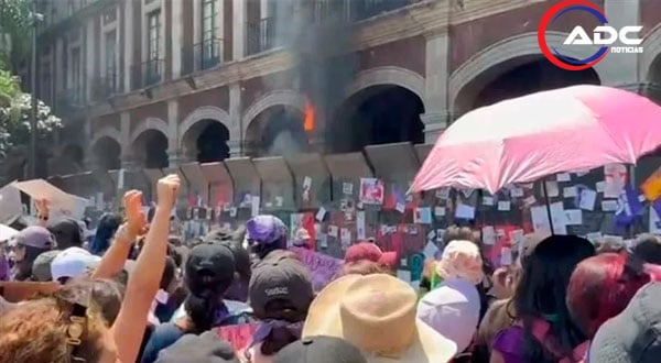En la Plaza de Armas, las manifestantes intentaron mover los muros instalados por primera vez en el edificio y lanzaron petardos, algunos de los cuales impactaron la fachada, provocando que uno de los pilares se incendiara durante varios minutos.