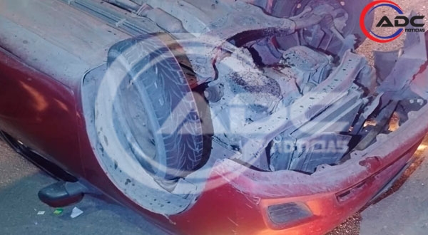 El accidente ocurrió alrededor de las 02:28 horas, cuando un vehículo Nissan Versa color guinda, con placas EKD-517-B, terminó volcado sobre su toldo, con los neumáticos hacia arriba y con severos daños materiales.