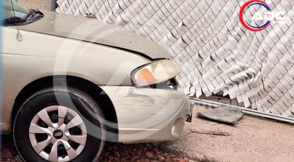 Cd. Delicias, Chih.- Un fuerte accidente se registró la tarde de este lunes en el sur de Delicias, luego de que un automóvil se impactara contra el cerco perimetral de una empresa maquiladora ubicada en ese sector de la ciudad.