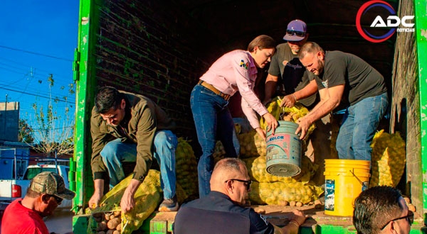 Meoqui, Chih.- En apoyo a la economía de las familias meoquenses, el Gobierno Municipal lleva a cabo un programa de apoyos alimentarios, beneficiando a más de 400 familias en la cabecera municipal en una primera entrega, encabezada por la alcaldesa Miriam Soto en el Parque de La Amistad, donde se distribuyeron 20 toneladas de papa sin costo alguno, además de ofrecer frijol y huevo a precios más accesibles que los del mercado, este programa contempla la entrega de 70 toneladas de papa en todo el municipio.