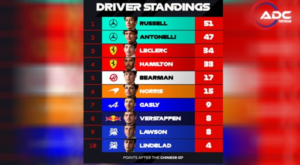 Tras las carreras que se disputaron en el Circuito Internacional de Shanghái hubo varios cambios en el Campeonato de Pilotos, mismo que lidera George Russell (Mercedes) con 51 puntos y es seguido por Antonelli, quien solo está a 4 unidades de su compañero de equipo.