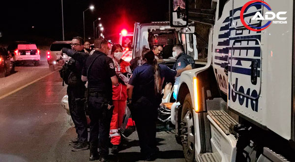 Chihuahua, Chih.- Un fuerte accidente vial se registró en el kilómetro 3 de la carretera Chihuahua-Aldama, cuando una mujer presuntamente bajo los efectos del alcohol fue impactada y arrastrada por un tráiler.