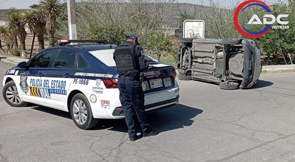 Chihuahua, Chih.-Un accidente vial se registró la tarde de este sábado en la colonia Unidad Tecnológico, luego de que un conductor omitiera un alto y provocara la volcadura de un vehículo, además de retirarse del lugar tras el percance.