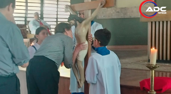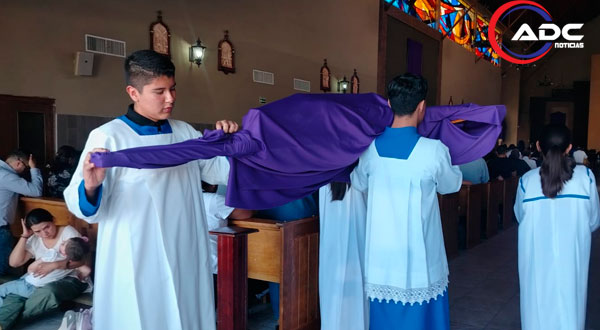 Cd. Delicias, Chih.- Con gran fervor, feligreses se reunieron en la iglesia Nuestra Señora de Guadalupe, mejor conocida como el Santuario, para la celebración y adoración de la Cruz de este Viernes Santo. El evento inició a las tres de la tarde, convocando a los fieles a un momento de reflexión y recogimiento.