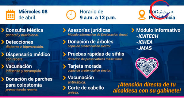 Finalmente, destacó que también estarán presentes módulos de la Junta Municipal de Agua y Saneamiento, donde los usuarios podrán atender adeudos, aclaraciones o cualquier trámite relacionado con el servicio, así como módulos de ICATECH e ICHEA, ampliando la oferta de apoyos para la comunidad.