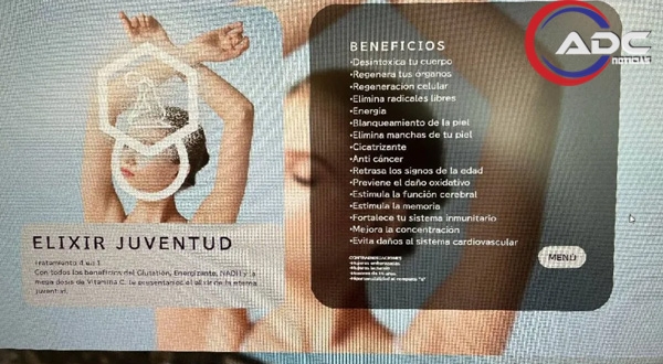 Entre los productos destaca el llamado “Elixir Juventud”, que, según la propia clínica, contiene compuestos como glutatión, NADH y vitamina C en altas dosis, a los que atribuyen propiedades como regeneración celular, fortalecimiento del sistema inmunológico y retraso del envejecimiento.
