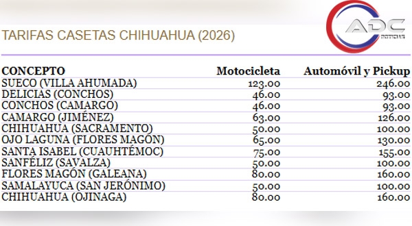 Chihuahua, Chih.-El Gobierno del Estado de Chihuahua anunció un ajuste en las tarifas de peaje de las carreteras estatales, con incrementos que van del 4 al 7.5 por ciento, los cuales entrarán en vigor a partir de las 00:00:01 horas del lunes 13 de abril de 2026.