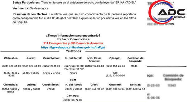 Camargo, Chih.- La Fiscalía General del Estado de Chihuahua activó una alerta de búsqueda para localizar a José Yadiel Arzabala Luna, un joven de 21 años que fue visto por última vez el pasado 6 de abril en la zona de los filtros de La Boquilla.