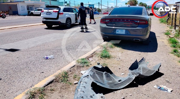 En el percance se vieron involucrados un automóvil Dodge Charger de modelo reciente y una camioneta Toyota Highlander, ambos con daños materiales de consideración. El impacto dejó afectaciones principalmente en la parte frontal del sedán y en el costado derecho de la unidad familiar.