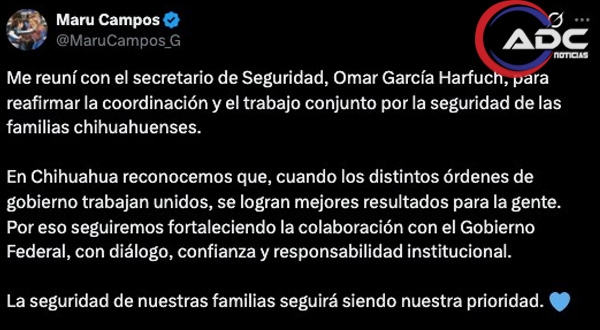Chihuahua, Chih.-Tras una reunión con el titular de la Secretaría de Seguridad y Protección Ciudadana, Omar García Harfuch, la gobernadora de Chihuahua, María Eugenia Campos Galván, reiteró la disposición de su administración para trabajar de manera coordinada con el Gobierno Federal en materia de seguridad, tras los hechos en los que murieron dos oficiales estadounidenses durante un operativo contra laboratorios clandestinos.