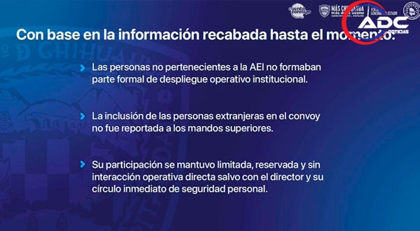 Durante una conferencia de prensa, se aclaró que las personas ajenas a la Agencia Estatal de Investigación no estaban integradas formalmente al despliegue institucional. No obstante, señalaron que existen indicios de una posible colaboración no oficial, cuya naturaleza será definida conforme avance la investigación.