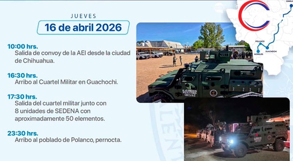 Las autoridades también dieron a conocer la cronología de los hechos. El 16 de abril, un convoy de aproximadamente 40 elementos de la AEI salió de la ciudad de Chihuahua y más tarde llegó a Guachochi, donde se coordinó con personal militar. Posteriormente, ambas fuerzas continuaron su trayecto hasta el poblado de Polanco, donde pernoctaron.