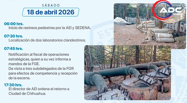 Al día siguiente, el grupo retomó el recorrido por caminos rurales, pasando por Morelos hasta llegar a El Pinal, donde establecieron un campamento. El 18 de abril iniciaron rastreos que derivaron en la localización de dos laboratorios clandestinos, por lo que se realizaron labores de inspección y resguardo del sitio antes de planear el regreso.