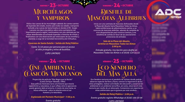 Para cerrar el programa, el sábado 25 se realizará el Eco-Sendero del Más Allá en el municipio de Julimes, una travesía guiada por especialistas donde los asistentes podrán conocer de cerca serpientes, tarántulas, aves y otros animales nocturnos en su entorno natural. “Será una jornada de educación ambiental y convivencia con la naturaleza; terminaremos con una fogata y leyendas de Chihuahua, uniendo lo ecológico con nuestras tradiciones”, explicó Juan Torrecillas.