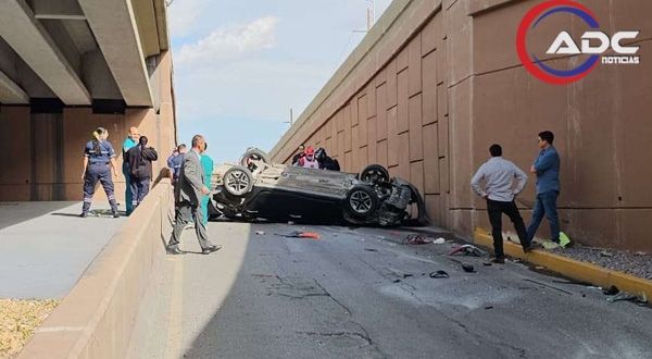 El incidente ocurrió cuando el conductor de un Nissan Sentra negro circulaba en sentido sur-norte y, al tomar la desviación hacia la Francisco Villa, superó el muro de contención y volcó sobre el pavimento.