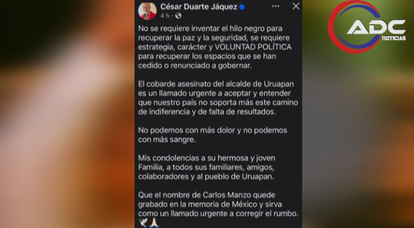 “El cobarde asesinato del alcalde de Uruapan es un llamado urgente a aceptar y entender que nuestro país no soporta más dolor ni más sangre”, escribió Duarte, quien también expresó sus condolencias a la familia de Manzo, a sus colaboradores y al pueblo de Uruapan. Finalmente, pidió que el nombre del edil quede grabado “en la memoria de México” como un recordatorio de la urgencia de corregir el rumbo nacional en materia de seguridad.