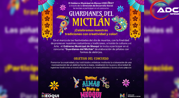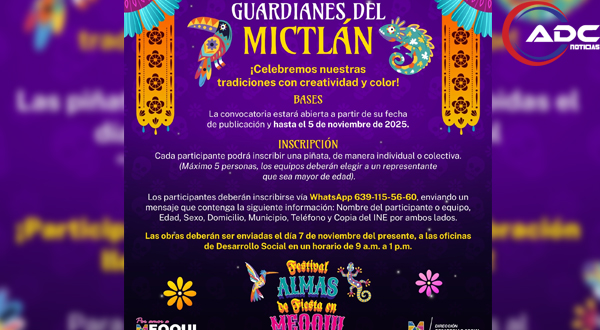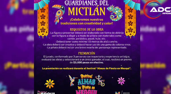 Meoqui, Chih.-Este próximo 5 de noviembre se cierra la convocatoria para el concurso “Guardianes del Mictlán” el cual consiste en la elaboración de piñatas en forma de Alebrijes, contando con un premio de 5 mil pesos para el 1er lugar, el cual se dará a conocer durante el evento “Almas de Fiesta en Meoqui” el próximo sábado 8 de noviembre a partir de las 6 de la tarde, en la explanada de la Presidencia Municipal.