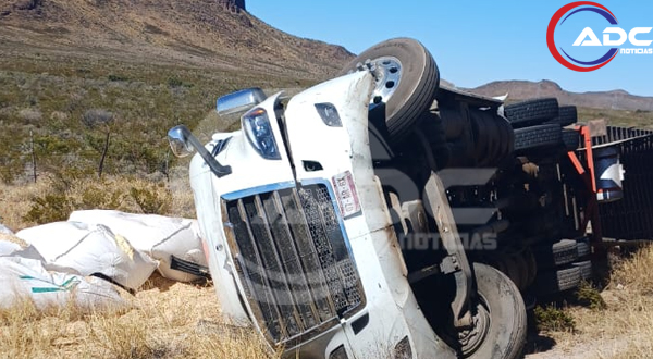 Camargo, Chih.- La mañana del lunes 3 de noviembre se registró la volcadura de un tráiler sobre el kilómetro 89 de la carretera Camargo–Ojinaga, hecho que movilizó a cuerpos de auxilio y autoridades.