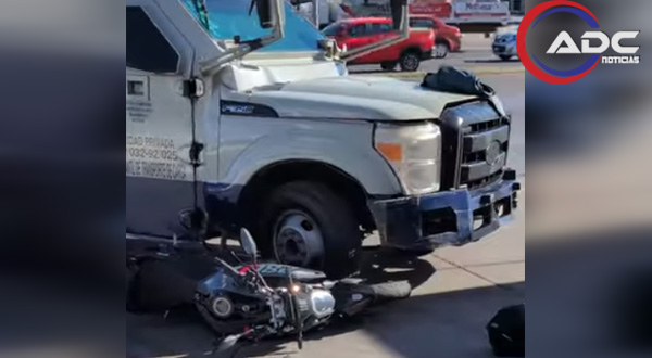 Chihuahua, Chih.-Un motociclista resultó con lesiones leves tras verse involucrado en un accidente con un camión de transporte de valores de la empresa Panamericano, sobre la avenida Tecnológico, en sentido norte a sur, poco después del cruce con avenida Agustín Melgar. El incidente ocurrió cuando el conductor de una motocicleta Italika 280 intentó rebasar por el lado derecho al vehículo blindado.