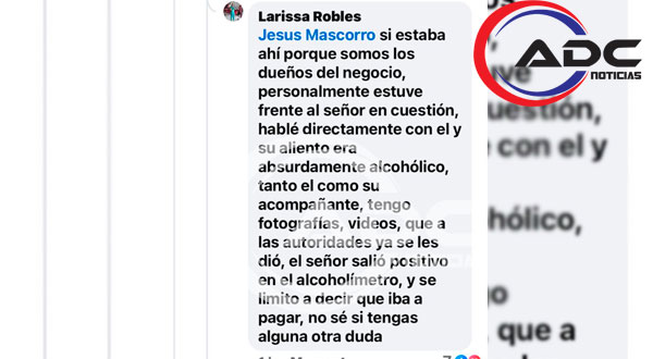 “Sí, yo estaba ahí porque somos los dueños del negocio. Personalmente estuve frente al señor en cuestión, hablé directamente con él y su aliento era absurdamente alcohólico, tanto él como su acompañante. Tengo fotografías y videos que ya se entregaron a lasautoridades. El señor salió positivo en el alcoholímetro y se limitó a decir que iba a pagar. No sé si tengas alguna otra duda”, afirmó.
