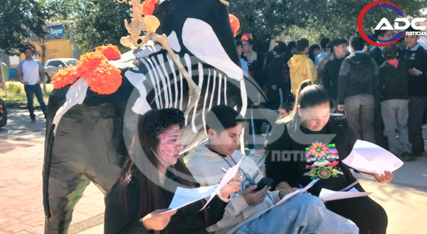 Camargo, Chih.- Posterior al Día de Muertos y con el propósito de exaltar las tradiciones mexicanas, la secundaria estatal 3032 realizó su tradicional Festival de Flores y Catrinas en el parque lineal, donde estudiantes mostraron su creatividad a través de disfraces, calaveras literarias y altares de muertos, invitando a la comunidad camarguense a disfrutar del evento.