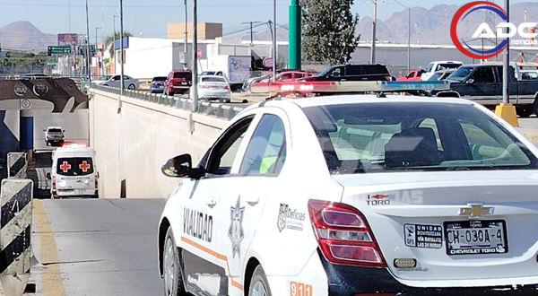 Cd. Delicias, Chih.- Un accidente vehicular se registró en la bajada del puente suprimido en sentido de oriente a poniente, es decir, de la colonia Carmen Serdán hacia el centro de la ciudad, en donde una motocicleta en la que viajaban dos personas impactó contra un vehículo de la marca Toyota, generando la movilización de cuerpos de auxilio y autoridades viales.