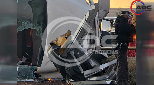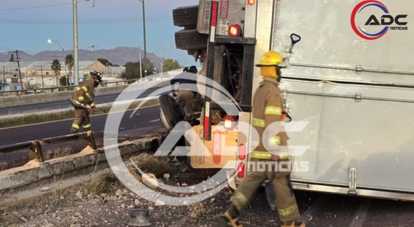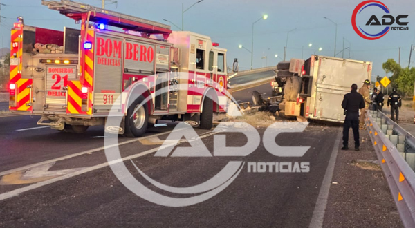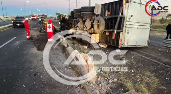 Cd. Delicias, Chih.- Un fuerte choque-volcadura registrado esta mañana en el puente del Cielo Vista dejó a un chófer que vivió para contarlo y daños cuantiosos en el camión que impactó la contención del acceso elevado.
