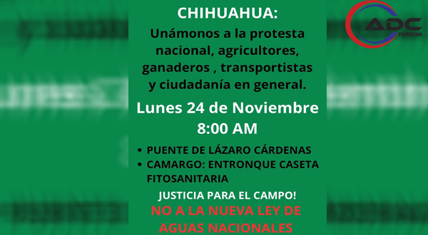 Chihuahua, Chih.- Autoridades locales informaron que el próximo lunes 24 de noviembre, a partir de las 8:00 AM, se llevará a cabo una protesta nacional que incluirá bloqueos en puntos estratégicos de la ciudad y sus alrededores.