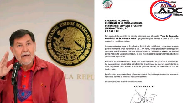 Tijuana.- El miércoles se anunció oficialmente la suspensión del foro en el que participaría el jueves el senador por Morena, Gerardo Fernández Noroña, en la Cámara Nacional de Comercio (CANACO) en Tijuana.